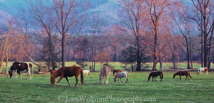 Horses grazing in Cades Cove meadow, Great Smoky Mountains National Park