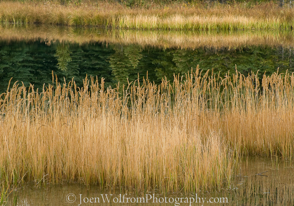 Bank, grasses, and reflection on the quiet Snake River at Schwabacher Landing, Grand Tetons National Park